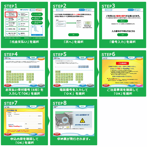 ファミリーマート店内に設置されている新型マルチコピー機(名称「Mコピー機」)を用いて、レジで支払う際に必要な「収納票」を入手してください。