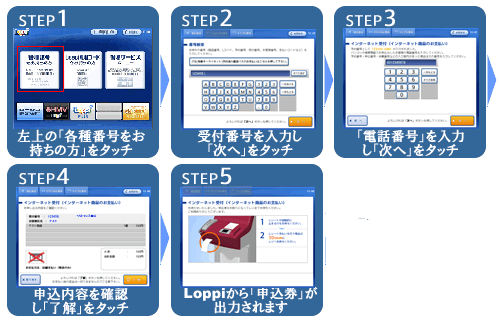 ローソン店内に設置されているLoppi (情報端末)を用いて、レジで支払う際に必要な「申込券」を入手してください。